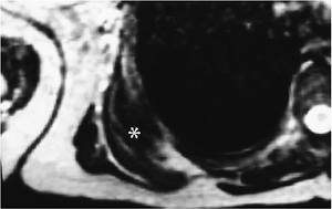 on T1-weighted and inhomogeneous high signal intensity on T2-weighted