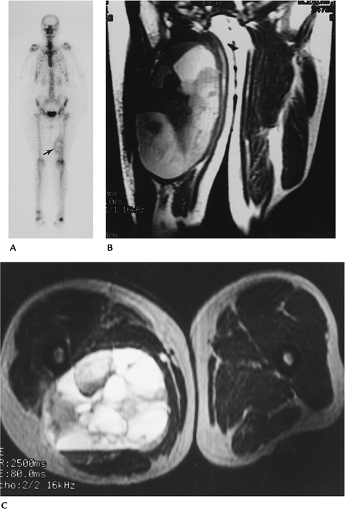 FIGURE 10-58 Malignant fibrous histiocytoma. (A) Radionuclide bone scan showing increased tracer in the soft tissues along the distal left femur (arrow). Coronal T1-weighted (B) and axial T2-weighted (C) images showing a large inhomogeneous lesion with areas of hemorrhage.