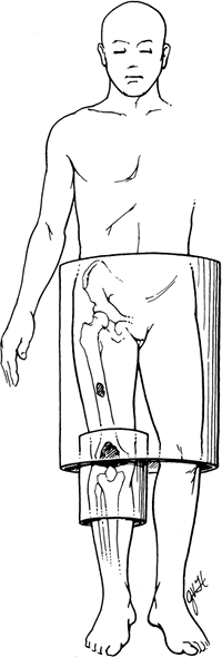 Patient with a knee sarcoma and midfemoral skip lesion. The knee coil would be optimal for knee imaging, but the skip lesion would not be identified unless the larger body coil was used to evaluate the entire femur. |