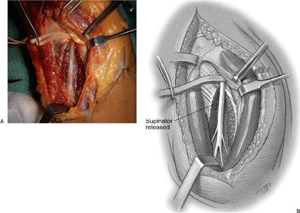 Figure 16-20. The supinator muscle may be released, exposing the full course of the nerve (A,B).