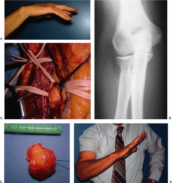 The “pseudo-ulnar claw” hand representative of a partial posterior interosseous nerve paralysis. It is not a true claw hand seen with low ulnar nerve palsy because there is no hyperextension at the metacarpophalangeal joint of the ring and little fingers; rather, there is a drop in these digits at this joint. B: Radiographs revealed a soft-tissue lucency adjacent to the radial head typical of a lipoma. C: The lipoma was exposed through the anterior approach. Traction sutures were placed in it to facilitate its delivery of the tumor. The epineurium of the radial nerve was incised longitudinally. This allowed for more room to extricate the tumor safely. D: Specimen lipoma. E: Recovery occurred gradually over a 6-week period.  |