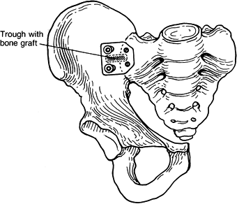 Figure 28.10. Right hemipelvis with fusion of the sacroiliac joint showing the bone graft and plate placement. -