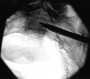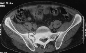 A 45-year-old woman with a very painful nonunion of the sacroiliac joint on the left plus symphyseal diastasis. Her initial fixation, months ago, was with an external fixator. Of note, she also had a nonunion of the tibia on the left and an L-5 nerve root deficit. |