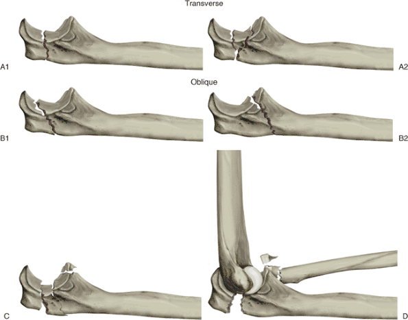 Figure 8.2. Olecranon fractures: (A1) transverse, (A2) transverse with joint depression, (B1) proximal oblique, (B2) distal oblique, (C) comminuted, (D) fracture-dislocation. (From