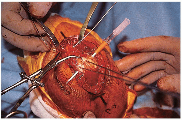 FIGURE 11-14. A 14-gauge angiocatheter is passed deep to the triceps tendon and the tip of the olecranon, anterior to the