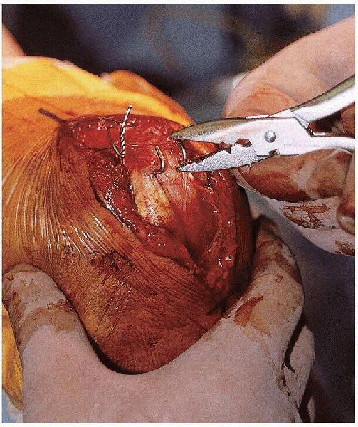 out through the opposite side of the triceps tendon (Fig. 11-15). Two loops are made in this wire, one knot on each side of the ulna (Fig. 11-16).