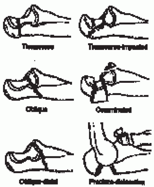 The Schatzker classification of olecranon fractures. (From McKee MD, Jupiter JB. Trauma to the adult elbow and fractures of the distal humerus. In: Browner BD, Jupiter JB, Levine AM, eds. Skeletal trauma. Philadelphia: WB Saunders, 1998:1470, with permission.) |