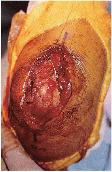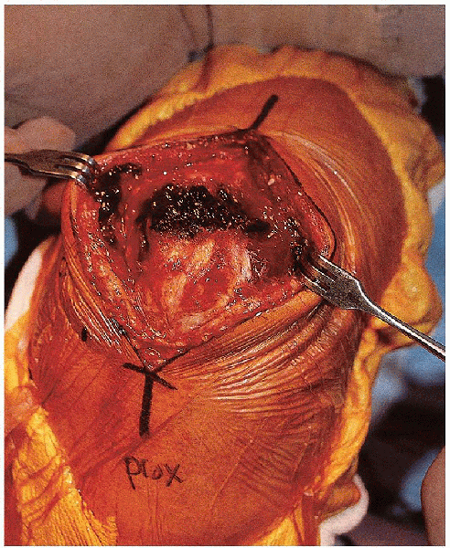 FIGURE 11-7. The incision is developed down to the fascia. A subcutaneous flap is elevated over the tip of the olecranon.