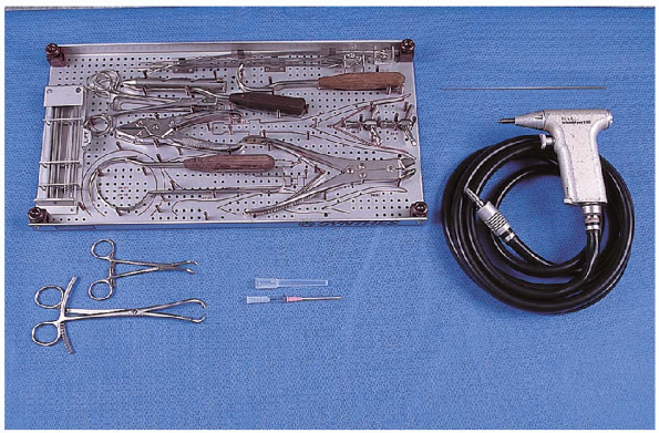 FIGURE 11-4. Equipment for tension band wiring of the olecranon: cerclage wire set (top left tray), 0.062-inch Kirschner wire (top right), large- and small-pointed reduction clamps (2) (bottom left), 14-gauge angiocatheter (bottom middle), and wire driver (bottom right).