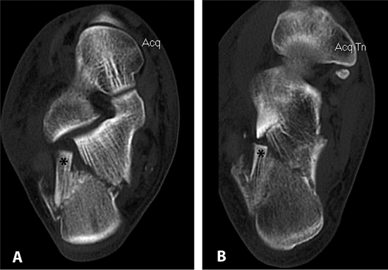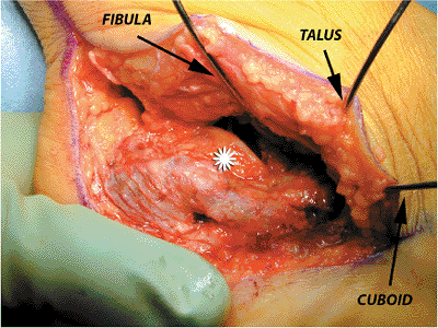 Figure 35.33. Evaluation of the peroneal tendon sheath. A. The insertion of an elevator into the sheath. B. An attempt is made to sweep the elevator over the fibula (arrow). This was not possible in this case.
