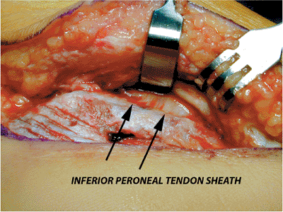 Freer elevator is placed into the peroneal tendon sheath at the distal