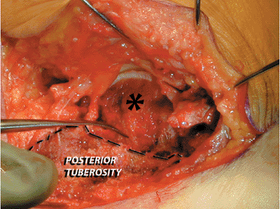 Axial view showing repositioning of posterior tuberosity through use of axial K wire to maintain position. The tuberosity is not yet completely reduced out of varus. |