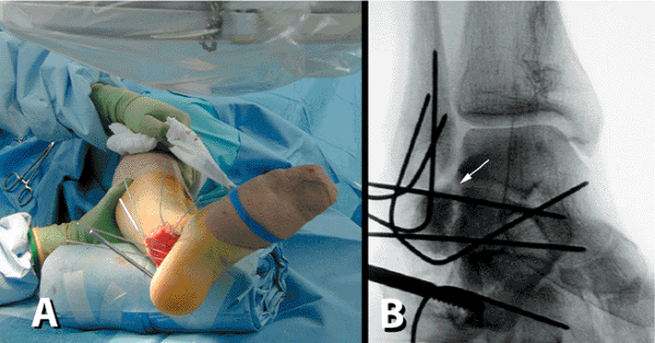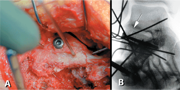 Figure 35.30. Definitive fixation of articular surface. A. Lag screw (3.5 mm) is placed with antirotation K wires in place. B. X-ray verifies anatomic joint reduction. Gap is closed and the articular surface is aligned perfectly (white arrow).