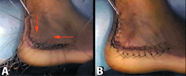 Figure 35.34. Wound closure. A. Figure-of-eight, interrupted, no. 0 Vicryl (Ethicon, Rutherford, NJ) are placed and tied from edges to corner (red arrows). B. Wound closure via an Allgöwer-Denoti stitch with no. 3 nylon. The knots are placed on the outside.