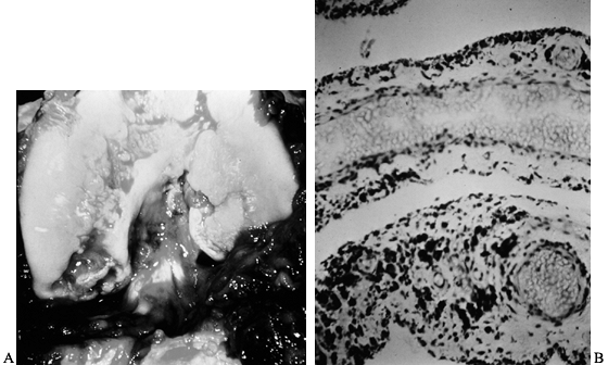 at the time of open synovectomy a few days after the x-ray studies were taken. There is extensive hyperplastic synovitis with full-thickness erosion of the articular surface of the weight-bearing surfaces of the medial and lateral condyles and the trochlea. This demonstrates the advanced destruction that can occur with chronic hemophilic synovitis despite a relatively benign-appearing x-ray study. B: Photomicrograph of the synovium from this patient showing hemosiderin pigment deposition on the surface taken up by the phagocytic synovial A cells. These cells migrate into the perivascular tissue of the subsynovial layer to return blood products to the general circulation. This patient was in the stage of chronic hemarthrosis, which is easy to understand with dilated venous channels immediately beneath the surface that are easily torn when the fragile, hypertrophic synovium gets caught between the eroded joint surfaces. (See also COLOR FIG. 136.2.) |