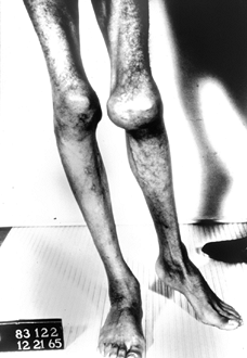 Thirteen-year-old boy with severe type A hemophilia. He demonstrates marked muscle atrophy and a lateral translation deformity of his left knee. |