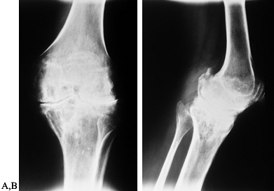 radiographs showing moderately advanced hemophilic arthropathy with almost complete loss of cartilage interval. Note the synovial cyst in the medial femoral condyle, flattening of the anterior part of the trochlea resulting from lateral subluxation of the patella, and loss of the normal posterior tilt of the tibial articular surface, which results from a flexion contracture during growth. These changes are typical of hemophilic arthropathy. |