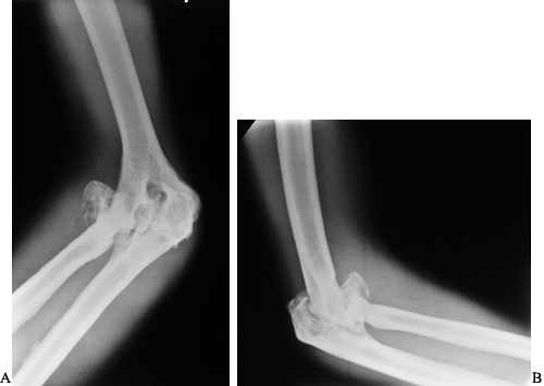radiographs showing end-stage arthropathy with large synovial cysts, complete loss of cartilage interval, flattening of the opposing joint surfaces, ossification of the posterior capsule, and nearly complete fibrous ankylosis. |