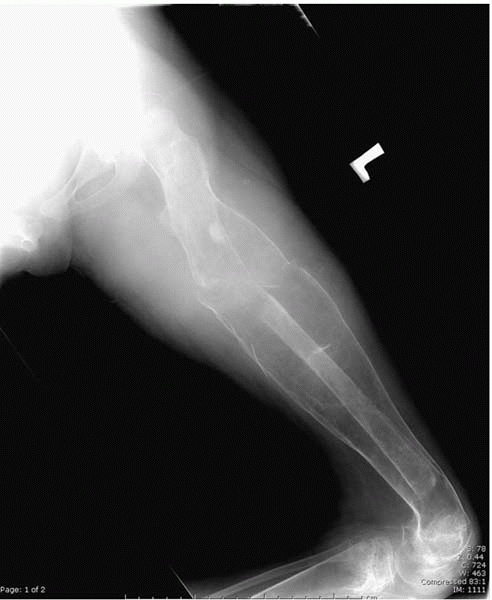 Radiograph of a femur of a nonambulator with cerebral palsy who has sustained multiple femur fractures. The clinical and radiographic appearance of this fracture may be confused with infection. |
