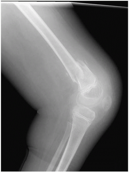 This boy with thoracic level spina bifida presented with a chief complaint of (painless) leg swelling. The leg was warm to touch. (B) Radiographs demonstrate copious new bone formation. (C) To make matters even more confusing, when children with spina bifida fracture through the growth plate, there may be no callus formation. Clinically, this young girl with thoracic level spina bifida had motion through the Salter I fracture of the distal femur. |