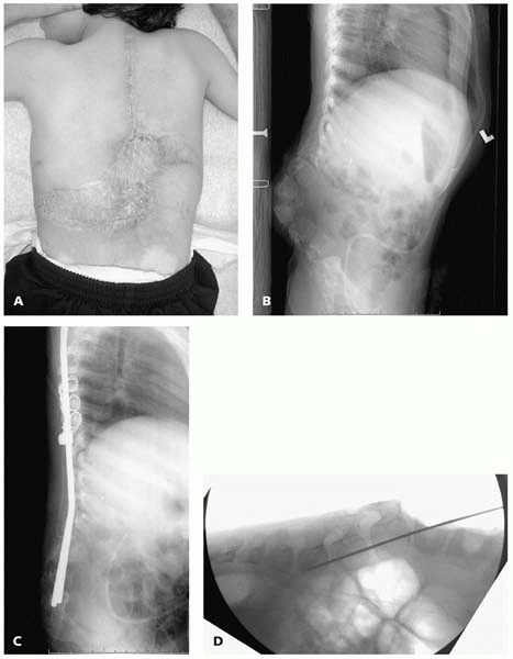 Child with thoracic level spina bifida with skin graft directly adherent to bone over the progressive kyphotic gibbus with frequent ulceration. Plastic surgical consultation concluded that there was no means of providing soft-tissue coverage for traditional posterior spinal instrumentation. (B) Preoperative lateral supine radiograph demonstrates rigid nature of kyphosis. (C) Surgery was performed with no incision distal to L3, by placing the rods directly into the vertebral bodies of L-4-S1. (D) Intraoperative imaging with preliminary K-wires assists in correct placement of rods. |