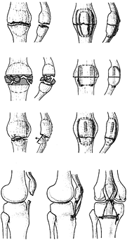 A comminuted fracture of the patella with two large superior and inferior bony fragments can be stabilized with excision of the comminuted portion and stabilization with two 4.0 interfragmentary compression screws and a tension band. C: In a fracture of the inferior third of the patellar pole, a single 4.0 mm cancellous screw can be used in an interfragmentary compression mode and completed with a tension band wire. D: Rupture of the infrapatellar tendon can be repaired with a Tevdek suture. A figure-of-eight tension band wire protects the repair and allows for early mobilization. (From Müller ME, Allgöwer M, Schneider R, Willenegger H. Manual of Internal Fixation. New York: Springer-Verlag, 1979, with permission.) |
