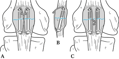 Figure 22.2. A: A transverse fracture of the patella can be stabilized with tension band wires on the anterior surface of the patella. B: