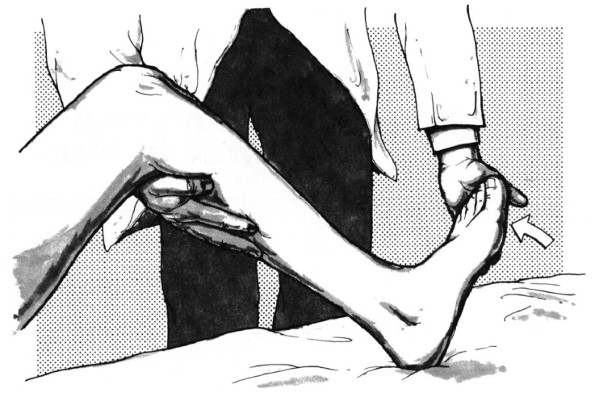 grasps the foot from below with the other hand, and quickly dorsiflexes