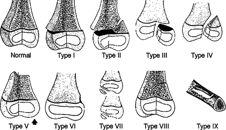 Figure 42.2. Salter-Harris (Types I to V) and Ogden (Types VI to IX) classification of physeal injuries in children.
