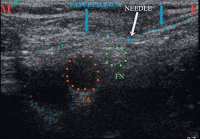 The femoral vein and femoral artery lie medial to the femoral nerve, underneath the fascia iliaca. The distance between the femoral nerve and the femoral artery varies, depending on the child’s age. FN, femoral nerve; FA, femoral artery; FV, femoral vein. |