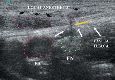 The needle is below the fascia iliaca and the ultrasound visualizes the local anesthetic surrounding the femoral nerve. FN, femoral nerve; arrows, block needle. |