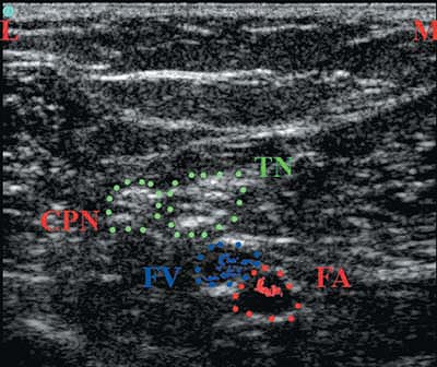 Visualization of the sciatic nerve terminal branches (common peroneal and tibial nerve) at the popliteal fossa level. TN, tibial nerve; CPN, common peroneal nerve; FV, femoral vein; FA, femoral artery; M, medial side of the patient; L, lateral side of the patient. |