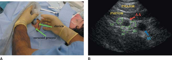 The probe is held 1 cm below the coracoid process and the needle is advanced at a 5° to 10° angle, in relationship to the probe. The brachial plexus cords surround the axillary artery. AA, axillary artery; AV, axillary vein; PMAJOR, pectoralis major muscle; PMINOR, pectoralis minor muscle; LC-PC-MC, lateral, posterior, medial cord of the brachial plexus. |