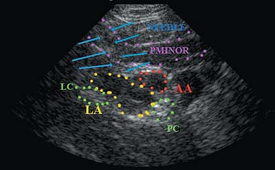 The tip of the needle is below the pectoralis minor and the local anesthetic is collecting around the axillary artery, pushing the lateral cord more laterally. LA, local anesthetic; AA, axillary artery; LC, lateral cord; PC, posterior cord; PMINOR, pectoralis minor. |