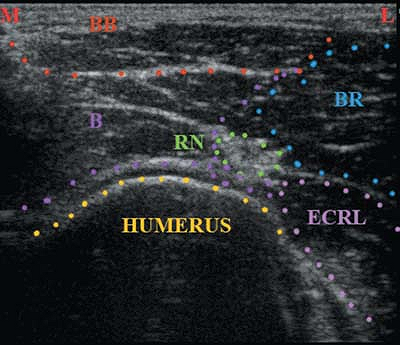 Ultrasound image of the radial nerve, approximately 2 cm above the lateral epicondyle of the humerus. B, brachialis muscle; BB, biceps brachii muscle; BR, brachioradialis muscle; ECRL, extensor carpi radialis longus; RN, radial nerve; M, medial side of the arm; L, lateral side of the arm. |