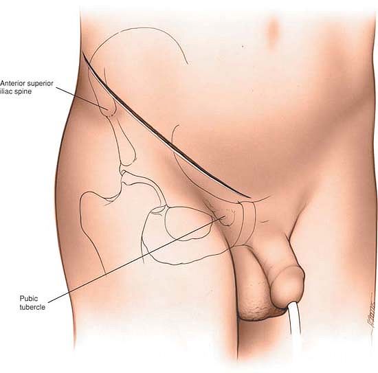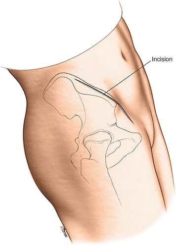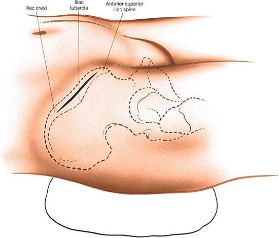 Figure 7-2 Make an 8-cm incision parallel to the iliac crest and centered over the iliac tubercle.