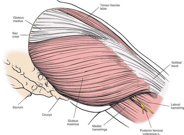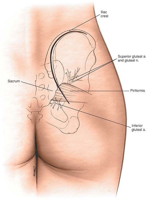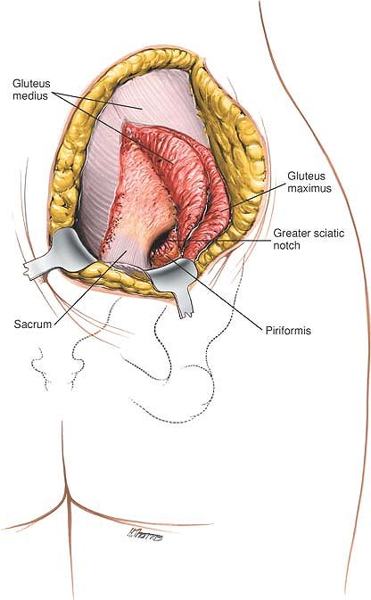 the gluteus maximus muscles (Fig. 7-40). Retract the split edges of the fascia to reveal the piriformis muscle and the short external rotators of the hip (Fig. 7-41). Partial detachment of the insertion of gluteus maximus from the femur will facilitate mobilization of this muscle.