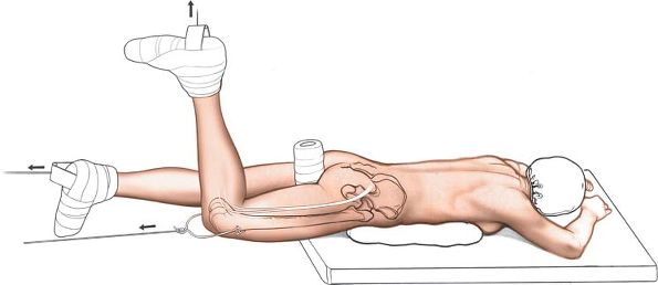 Position of the patient for posterior approach to the acetabulum. Note the flexed position of the knee to prevent stretching of the sciatic nerve. |