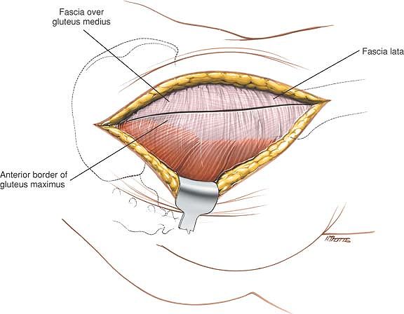 Incise the fascia lata in line with the skin incision. Extend the incision superiorly along the anterior border of the gluteus maximus muscle. |