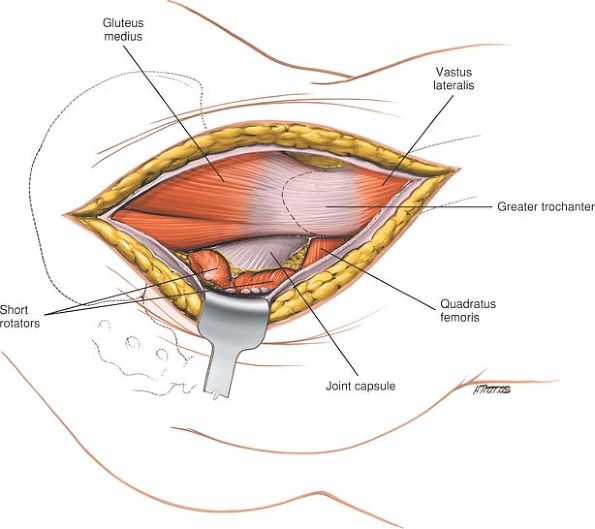 Figure 7-42 Divide the short external rotator muscles and the piriformis as they insert into the femur.