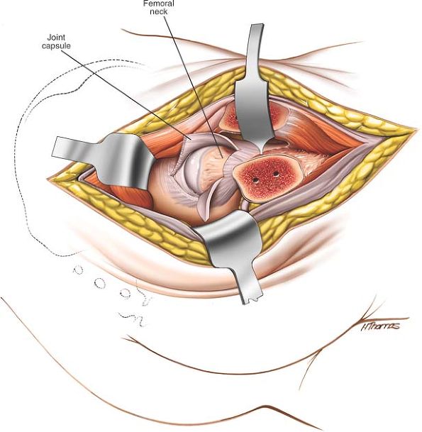 To complete exposure of the anterior capsule, mobilize the vastus intermedius from the femur. Perform a T-shaped capsulotomy of the anterior hip joint capsule to expose the femoral head and neck, together with the anterior lip of the acetabulum. |