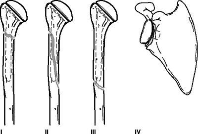 6.6. Classification of periprosthetic shoulder fractures. Type I: fractures occurring proximal to the tip of the prosthesis. Type II: fractures occurring in the proximal portion of the humerus with distal extension beyond the tip of the prosthesis. Type III: fractures occurring entirely distal to the tip of the prosthesis. Type IV: fractures occurring adjacent to the glenoid prosthesis. (From Bucholz RW, Heckman JD, eds. Rockwood and Green’s Fractures in Adults, 5th ed. Baltimore: Lippincott Williams & Wilkins, 2002:587.)