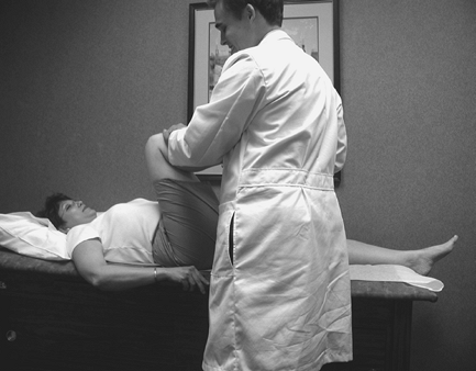 Figure 1-4 Abduction: Average ROM is 0 to 40 degrees. Note that examiner’s hand stabilizes pelvis to prevent pelvic tilt.