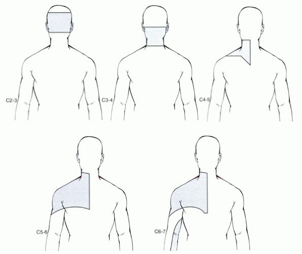 Figure 1-8 Patterns of pain provoked by discography from the C2-3 to the C6-7 disc levels. (From Grubb SA, Kelly CK. Cervical discography: clinical implications from 12 years of experience. Spine 2000;25:1382-1389.)
