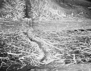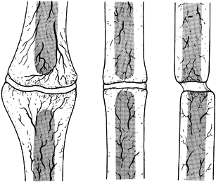 Microangiogram of a 6-week-old canine radius fracture, showing delayed union. Note the tremendous increase in vascularity and the inability of the capillaries to penetrate the fibrocartilage of this hypertrophic delayed union. (From Rhinelander FW. The Normal Microcirculation of Diaphyseal Cortex and Its Response to Fracture. J Bone Joint Surg Am 1968;50:784.) |