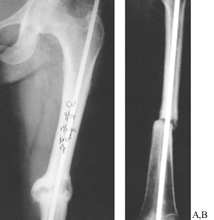 Hypertrophic vascular nonunion 1.5 years after inadequate intramedullary nailing. Motion continues at the fracture with weight bearing. Bending, torsional, and shear stresses are not stabilized by the nail. B: Atrophic avascular nonunion 1 year after inadequate intramedullary nailing. Mechanical instability and avascularity have caused this nonunion. |