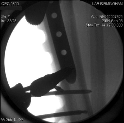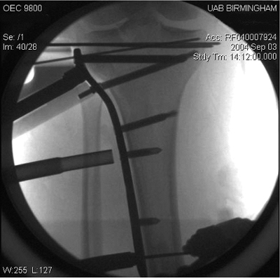 Figure 27.18. AP view showing three of four distal screws in place. The final screw will replace the distal wire.