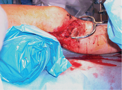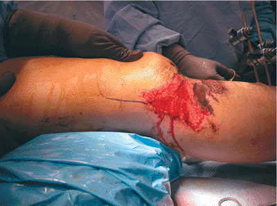 Figure 27.2. Contusions, abrasions, and soft-tissue injury following a high-energy tibial plateau fracture.