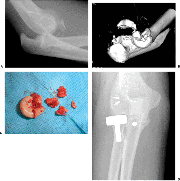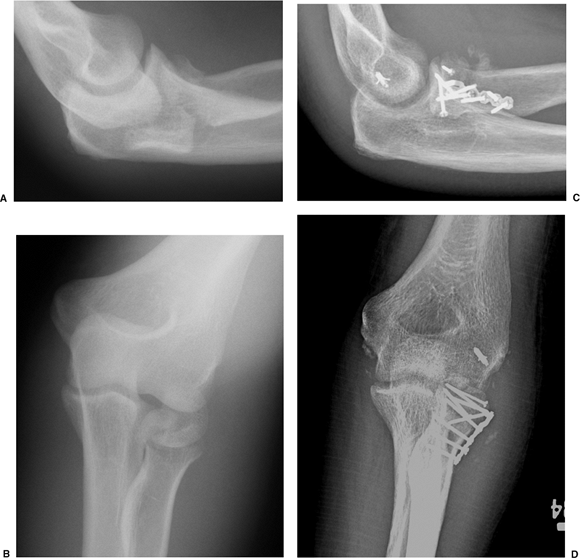 Figure 9.10. Early failure of fixation is common a complex fracture of the radial head is treated. A. This fracture of the entire head created several small fragments. B. There was an associated elbow dislocation. C. The radial head was repaired with a plate and screws. D.