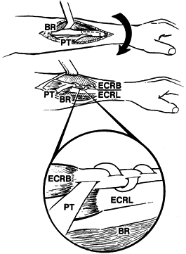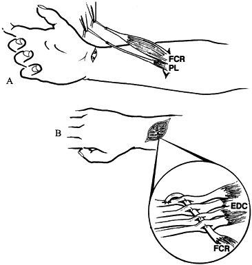 radial abduction and the flexor carpi radialis under mild tension (Fig. 55.11D).